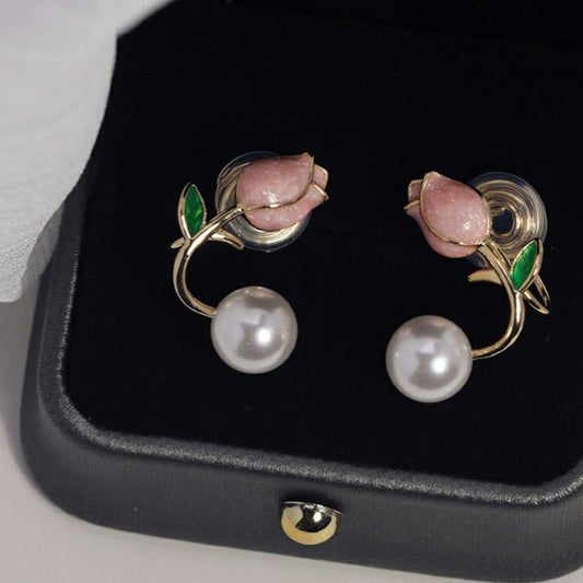 粉色郁金香珍珠耳夹 Pink Tulip Pearl Clip On Earring