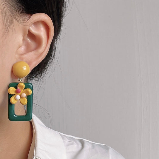 森系不对称方形花朵耳夹 Asymmetric Clip On Earring