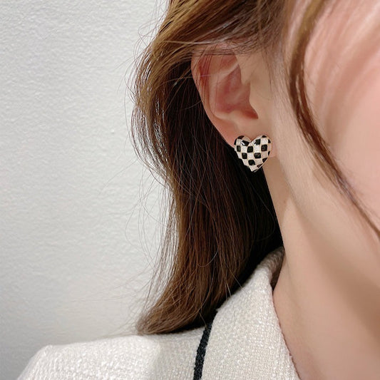 棋盘格爱心耳夹 Checkered Heart Clip On Earring